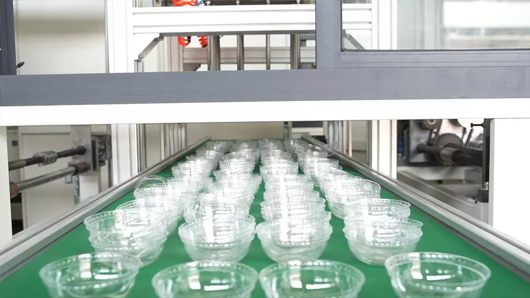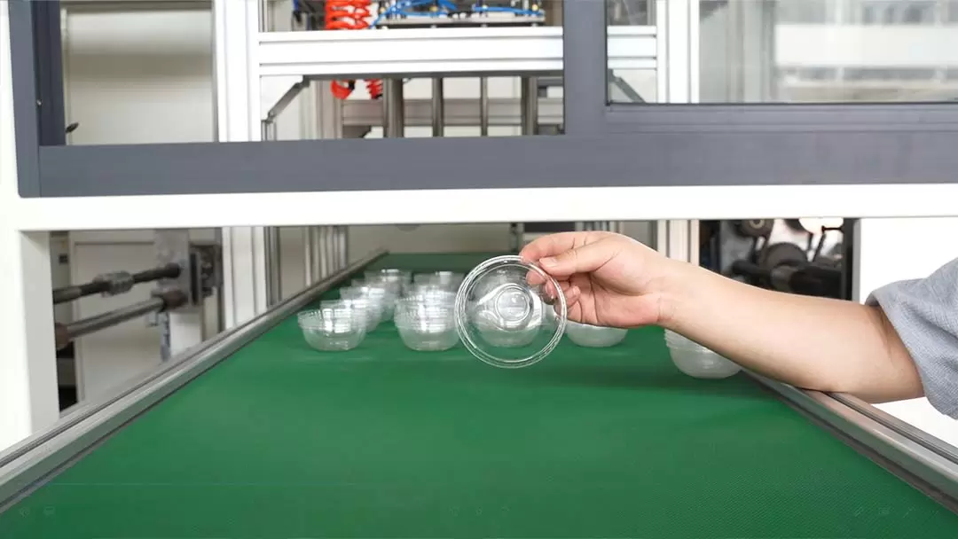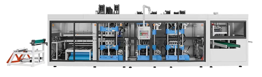 La machine de thermoformage plastique intègre l'alimentation, le chauffage, le formage, le poinçonnage, la découpe, l'empilage et le recyclage des déchets.