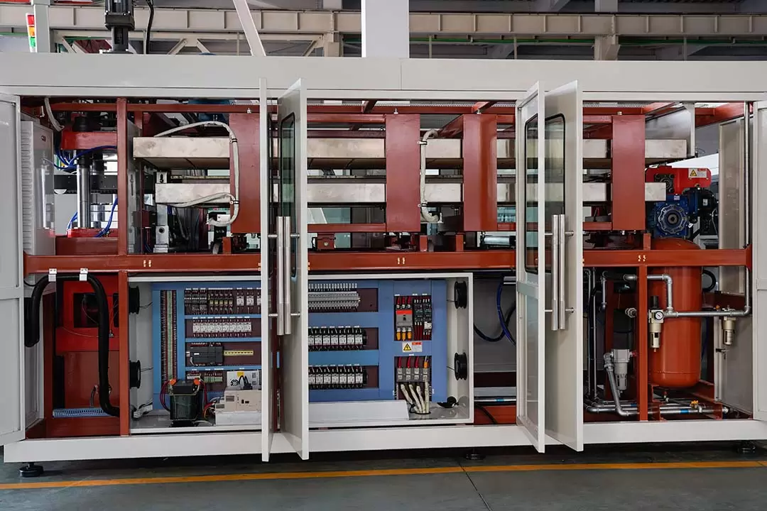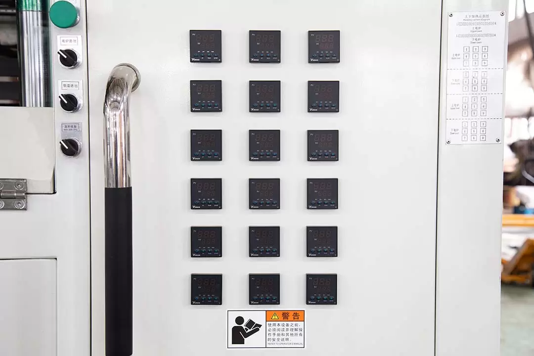 Système de contrôle de la température : à l'aide d'un contrôleur programmable PLC avancé, il peut ajuster et surveiller avec précision la température de chauffage pour assurer un chauffage uniforme des feuilles de plastique, garantissant ainsi une qualité stable des produits finis.
