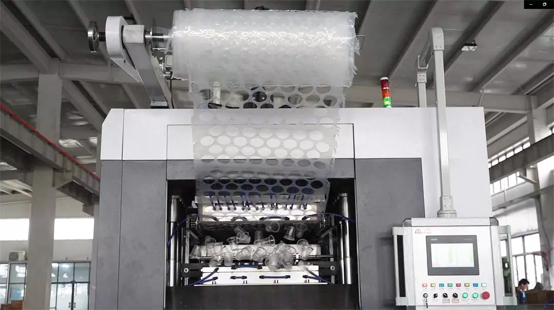Découpe : Les gobelets en plastique formés sont séparés des feuilles excédentaires par le dispositif de découpe pour obtenir des gobelets finis.