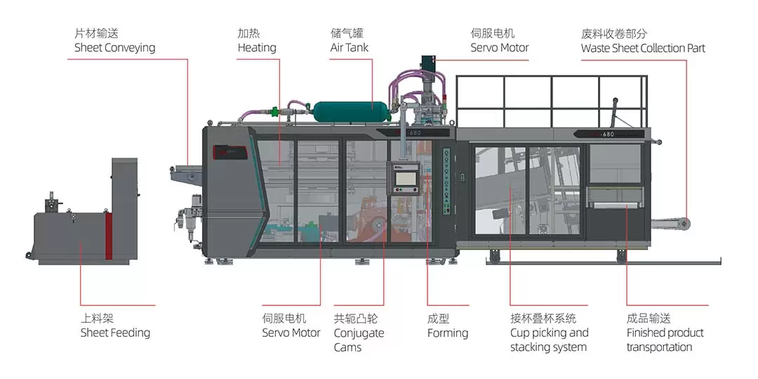 La thermoformeuse inclinable pour gobelets en plastique TFC-680 est le dernier-né de notre entreprise. Elle est principalement utilisée pour la production de gobelets en plastique de différentes spécifications. Elle adopte un moulage par pression positive et négative, est équipée d'un système de rotation du moule entièrement contrôlé par servomoteur et utilise deux paires de bielles à cames conjuguées pour l'inclinaison, le levage et le poinçonnage de la table de moulage. Ce nouveau type d'équipement, conçu pour un rendement élevé, une faible consommation d'énergie, une grande stabilité et une automatisation poussée, offre une solution idéale pour les gobelets en plastique jetables de moyenne et grande capacité.